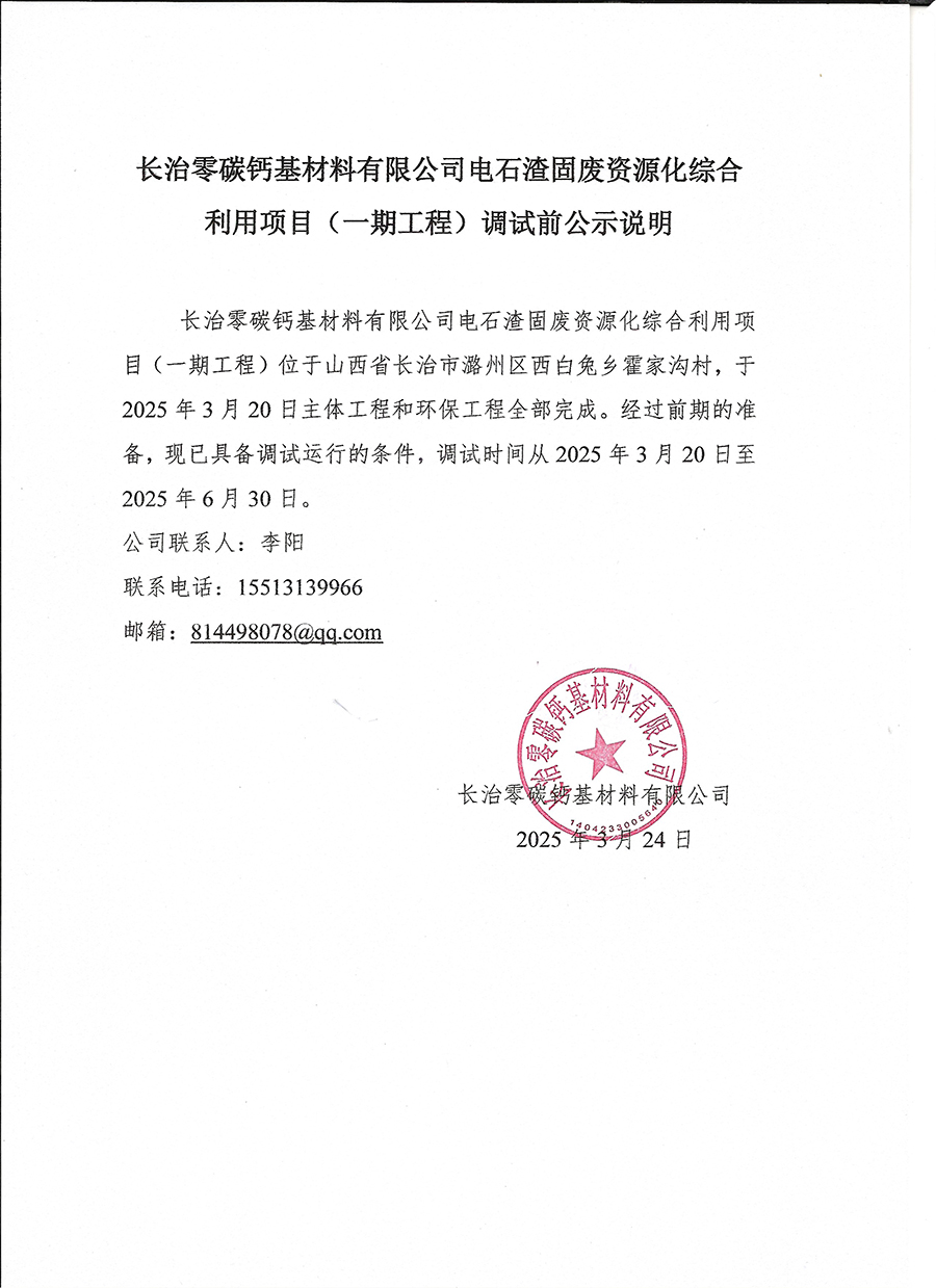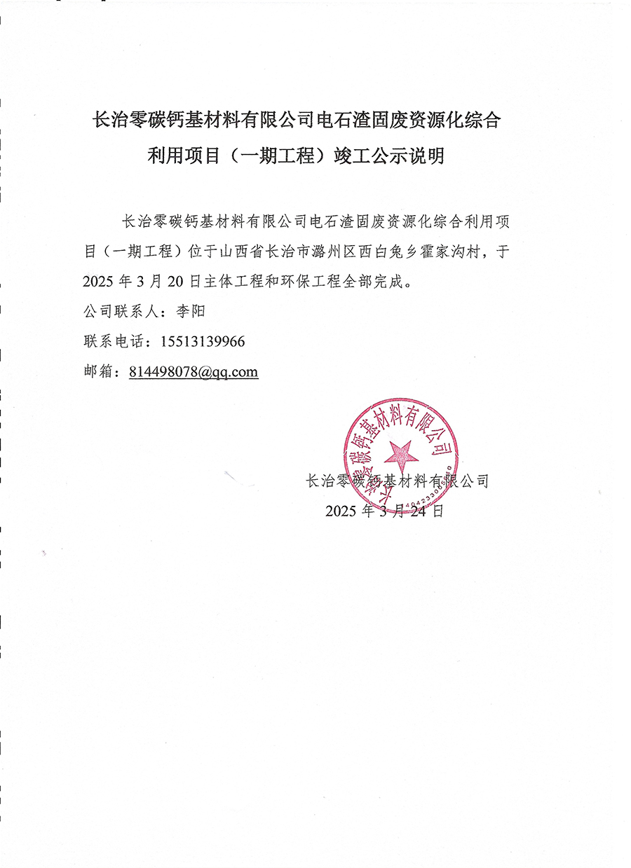 長(cháng)治零碳鈣基材料有限公司電石渣固廢資源化綜合利用項目(一期工程)竣工公示說(shuō)明